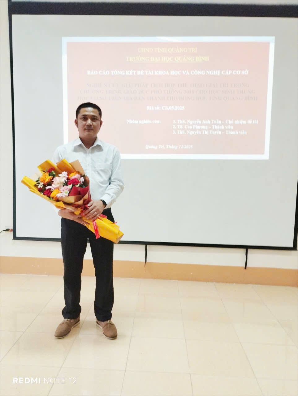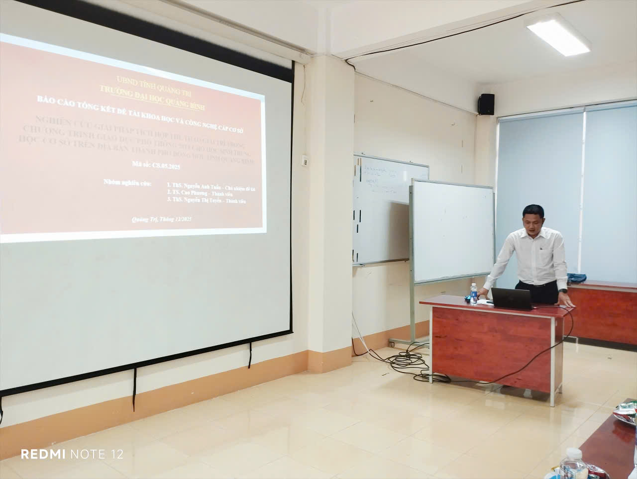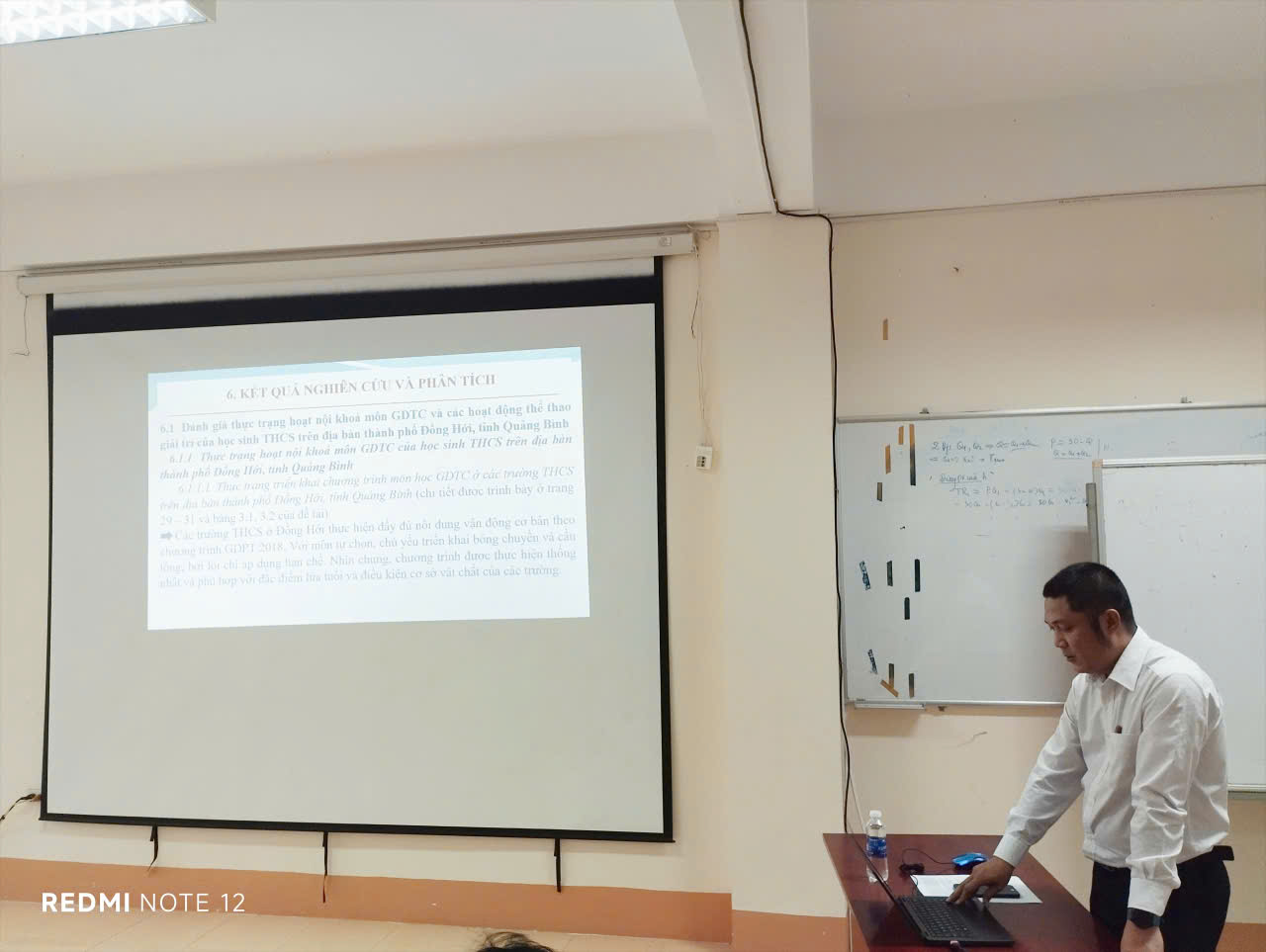 Thực hiện Quyết định số 1179/QĐ-ĐHQB ngày 27/11/2025 của Hiệu trưởng Trường Đại học Quảng Bình về việc thành lập Hội đồng đánh giá nghiệm thu đề tài khoa học và công nghệ cấp cơ sở, ngày 05/12/2025, tại phòng Tự nghiên cứu, Hội đồng đã tiến hành nghiệm thu đề tài: “Nghiên cứu giải pháp tích hợp Thể thao giải trí trong chương trình GDPT 2018 cho học sinh THCS trên địa bàn thành phố Đồng Hới, tỉnh Quảng Bình” (Mã số: CS.05.2025)